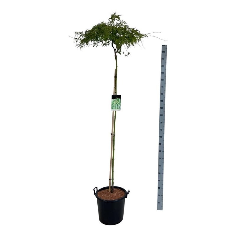 Dieser Ahorn hat auffällige, tief eingeschnittene Blätter, die ihm ein zartes, fast windzerzaustes Aussehen verleihen. Die Blätter sind im Sommer meist grün, können aber im Herbst eine schöne Palette von Rot, Orange und Gelb zeigen. Der Baum bleibt relativ klein und wird oft als Zierbaum oder als Kübelpflanze verwendet. Die Zweige wachsen kaskadenförmig und verleihen dem Baum ein üppiges, fächerförmiges Aussehen.