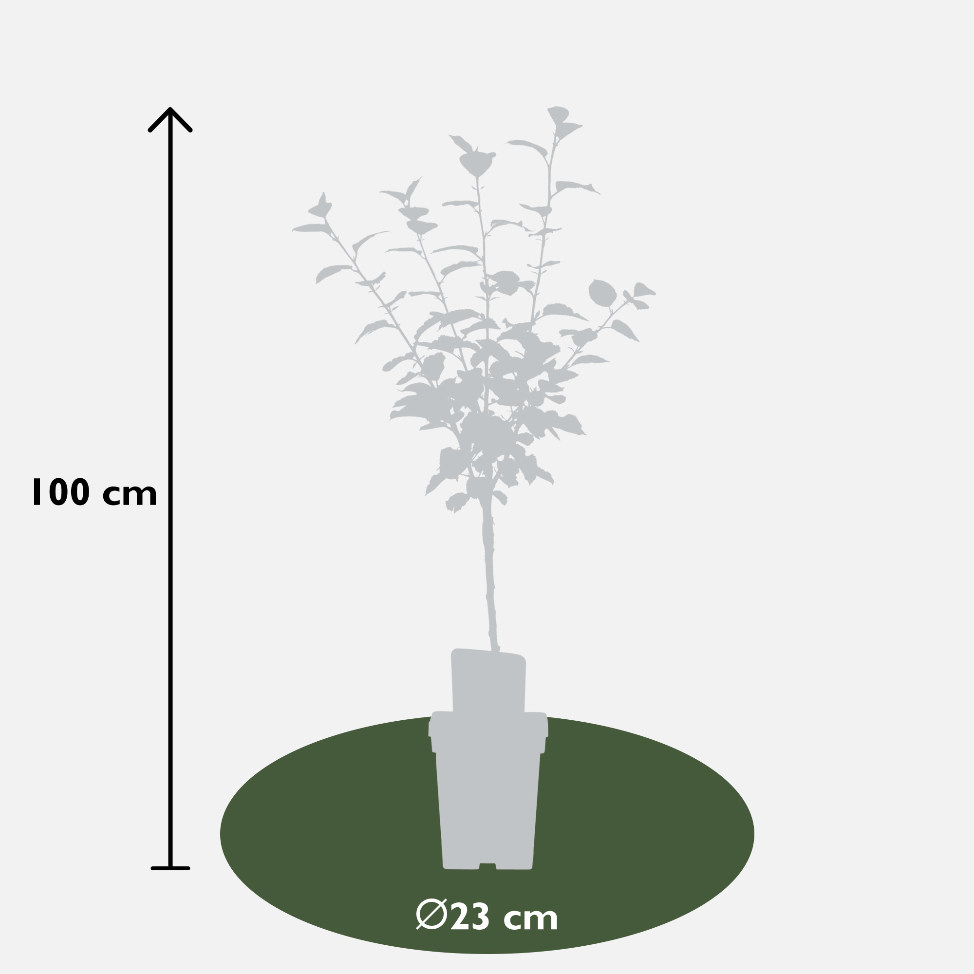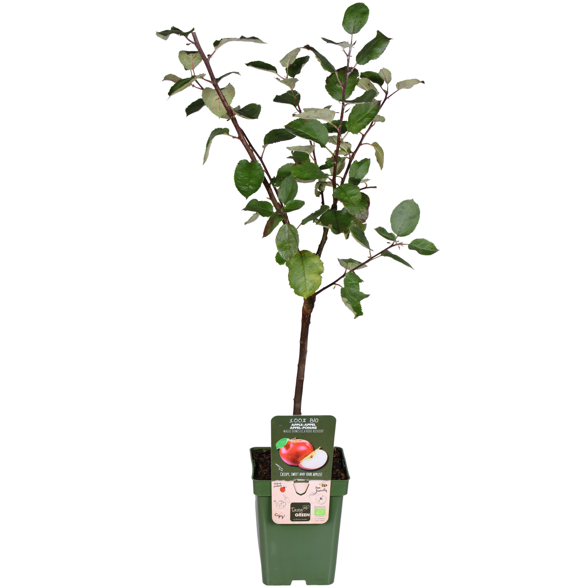 Tasty Green, 100% biologisch angebaute Früchte. Das bedeutet, dass beim Anbau nur pflanzliche und tierische Materialien verwendet wurden. Der Topf und das Etikett sind aus recyceltem Kunststoff und somit eine saubere Lösung für die Umwelt. Malus Domestica Rode Boskoop' ist ein Apfelbaum, der auch als Goudreinet oder Schone van Boskoop bekannt ist. Der Apfel hat eine stumpfe Farbe, die von grün-gelb bis bronzen reicht und oft eine Röte aufweist. Er ist ein ziemlich fester Apfel mit einem frisch-säuerlichen, leicht süßen Geschmack. Wegen seiner trockenen und etwas rauen Schale ist er als Handapfel weniger beliebt. Da er jedoch seine Textur und seinen Geschmack beim Kochen beibehält, ist er einer der besten Äpfel für Apfelkuchen oder Apfelmus.