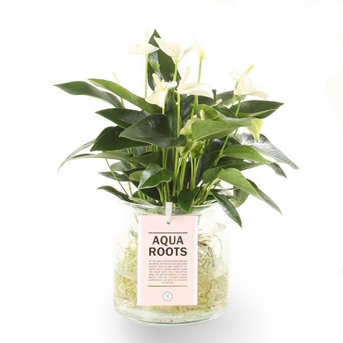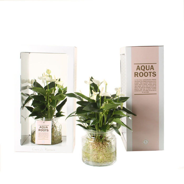 Die Aqua Roots-Pflanze ist vollständig von Erde befreit. Die Wurzeln sind durch das Glas, in dem die Pflanze steht, vollständig sichtbar. Sie müssen lediglich dafür sorgen, dass sich ausreichend Wasser im Glas befindet. Die Pflanze wird mit Wasserperlen geliefert. Sie können die Pflanze darin belassen oder diese durch Wasser ersetzen.