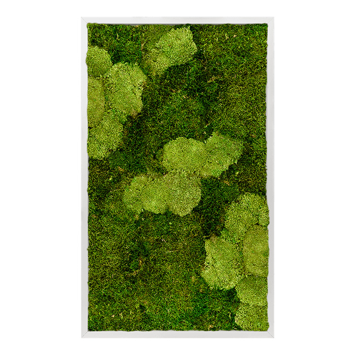 Dieses Gemälde besteht zu 50 % aus Flachmoos und zu 50 % aus Kugelmoos, was das Gemälde noch lebendiger macht. Darüber hinaus können Sie aus vier verschiedenen Rahmen wählen: Naturecast, Raw Grey, Natural und Rock.