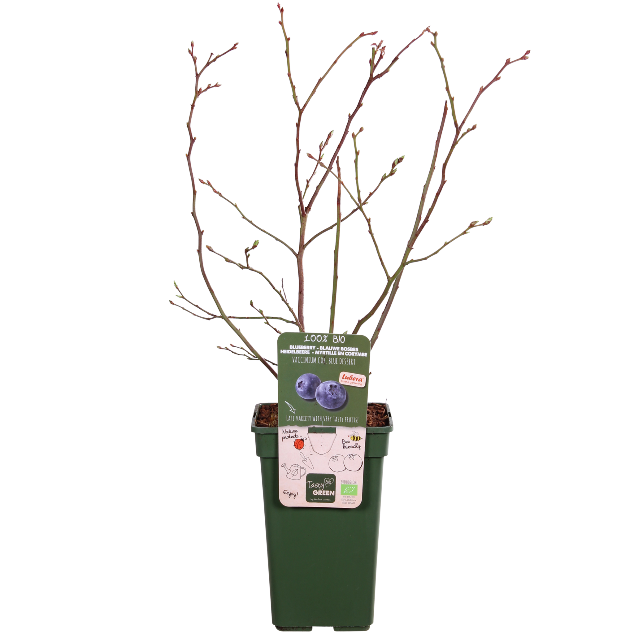 Vaccinium corymbosum Blue Dessert" ist eine Heidelbeere, auch Amerikanische Heidelbeere genannt. Der Strauch wird etwa 100 cm hoch und gehört zu den kleinwüchsigen Heidelbeerarten. Sie wächst nur in saurem Boden. Sandige und torfige Böden haben einen sauren Boden und sind daher für diese Pflanze geeignet. Wenn Sie die Pflanze in Lehmboden setzen wollen, müssen Sie saure Erde hinzufügen, damit sie überleben kann. Sie hat dünne Zweige und kleine, frischgrüne Blätter. Die Heidelbeere blüht in Büscheln und die Blüten sind weiß-cremefarben bis rosa. Die Blütezeit ist in der ersten Maihälfte. Sie ist eine kräftige Pflanze, die viele Früchte trägt. Die Beeren sind mittelgroß, hellblau, fest und haben einen guten Geschmack. Sie enthalten viele Antioxidantien, sind also sehr gesund! Sie können von Mitte Juli bis Mitte August gepflückt werden. Frische Blaubeeren sind eine Woche lang haltbar, aber man kann sie auch einfrieren. Diese Pflanze ist selbstbestäubend und braucht fast keine Pflege. Schützen Sie die Beeren mit einem Netz vor Vögeln. Die Pflanze ist winterhart und sehr widerstandsfähig gegen Krankheiten.