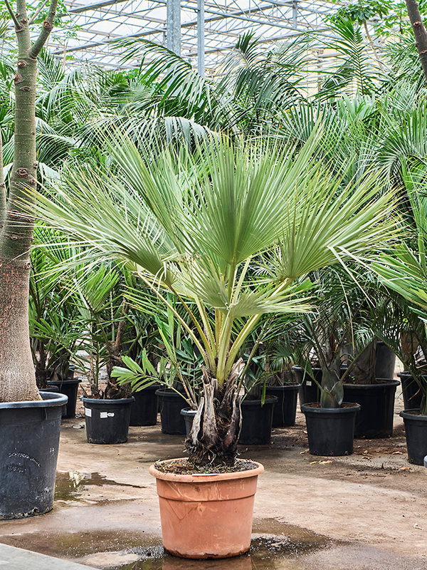 Diese Palme ist besonders pflegeleicht. Gießen Sie sie mäßig – die Brahea Armata verträgt Trockenheit besser als Staunässe. Lassen Sie die oberste Schicht der Erde zunächst gut trocknen, bevor Sie erneut gießen. Im Frühjahr und Sommer können Sie monatlich etwas Palmendünger hinzufügen, um ihr Wachstum und ihre Blattfarbe zu unterstützen. Umtopfen ist nur alle paar Jahre erforderlich, da die Palme langsam wächst.