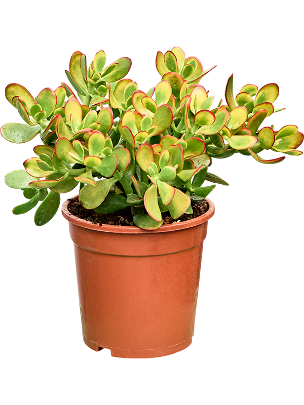 Crassula ovata 'Sunset', auch als Jadepflanze bekannt, ist eine in Südafrika beheimatete Sukkulentenart. Diese Pflanze gehört zur Familie der Crassulaceae, einer Pflanzengruppe, die für ihre Fähigkeit bekannt ist, Wasser in ihren dicken Blättern und Stämmen zu speichern. Diese Anpassung hat sie in die Lage versetzt, in den trockenen und felsigen Bedingungen ihres natürlichen Lebensraums zu überleben.