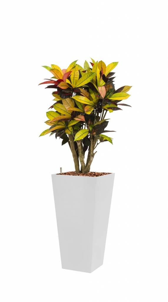 Croton Codiaeum oder Wunderstrauch hat seinen niederländischen Namen von seinen großen bunten Blättern, die sich weiß, gelb, rot, orange und sogar violett färben können. Der Croton stammt aus der Familie der Crotoneae (Euphorbiaceae), oder auf Niederländisch: Wolfsmilchgewächse. Diese Zimmerpflanze stammt ursprünglich aus Südostasien.