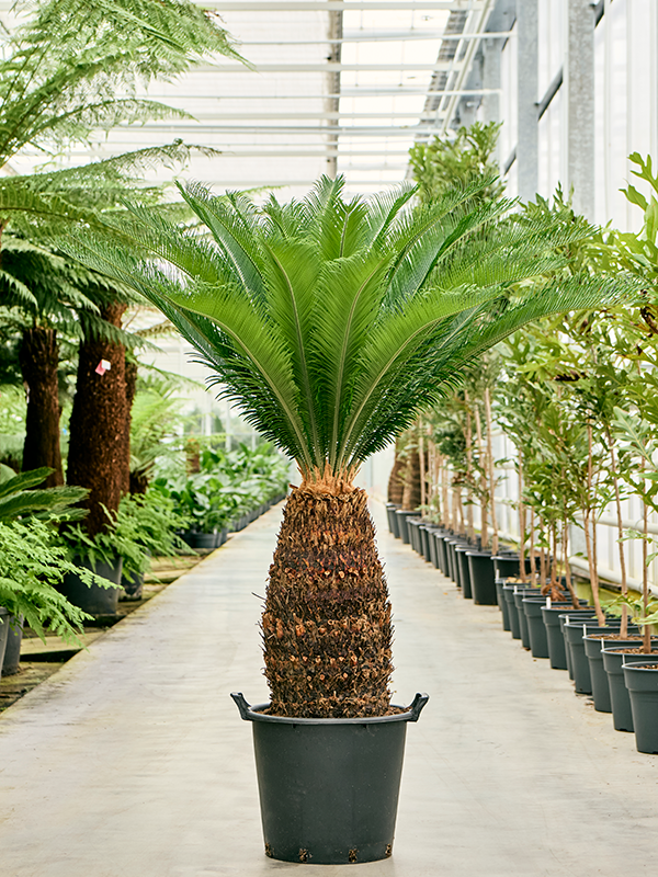 Cycas revoluta ist eine langsam wachsende, palmenartige Pflanze, die sich durch ihre harten, ledrigen, gefiederten Blätter auszeichnet. Die Pflanze kann bis zu 3 Meter hoch werden. Diese Pflanze entwickelt große Zapfen und trägt männliche oder weibliche Blüten, so dass einzelne Pflanzen männlich oder weiblich sind. Obwohl die Pflanze frischgrüne Blätter hat, sieht sie dank ihres holzigen Stammes eher wie eine Palme als ein Farn aus.