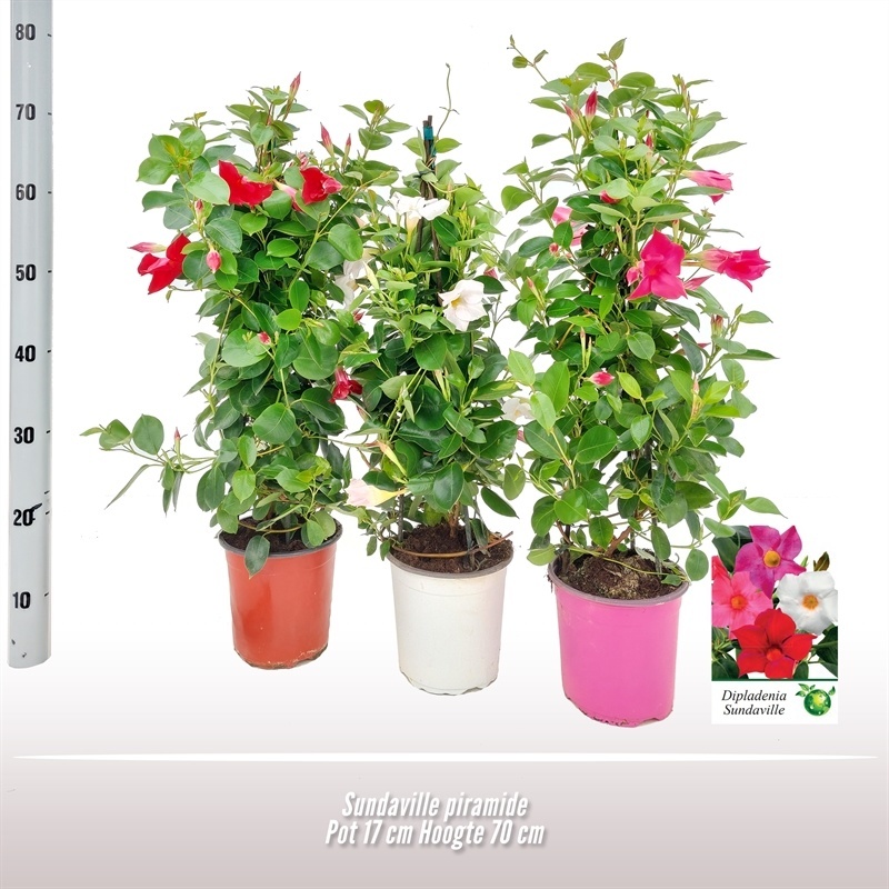 Die Dipladenia Pyramide rot S ist eine üppige Freilandpflanze, die Ihrer Terrasse, Ihrem Balkon oder Ihrem Garten sofort Wärme und Farbe verleiht. Ihre intensiv roten Trompetenblüten bilden einen wunderschönen Kontrast zu den glänzenden, dunkelgrünen Blättern und sorgen für ein lebendiges und elegantes Gesamtbild. Dank der pyramidenförmigen Stützstruktur wächst diese Dipladenia anmutig nach oben, was ihr ein gepflegtes und volles Aussehen verleiht – ideal als Blickfang in einem Topf oder Blumenkasten.