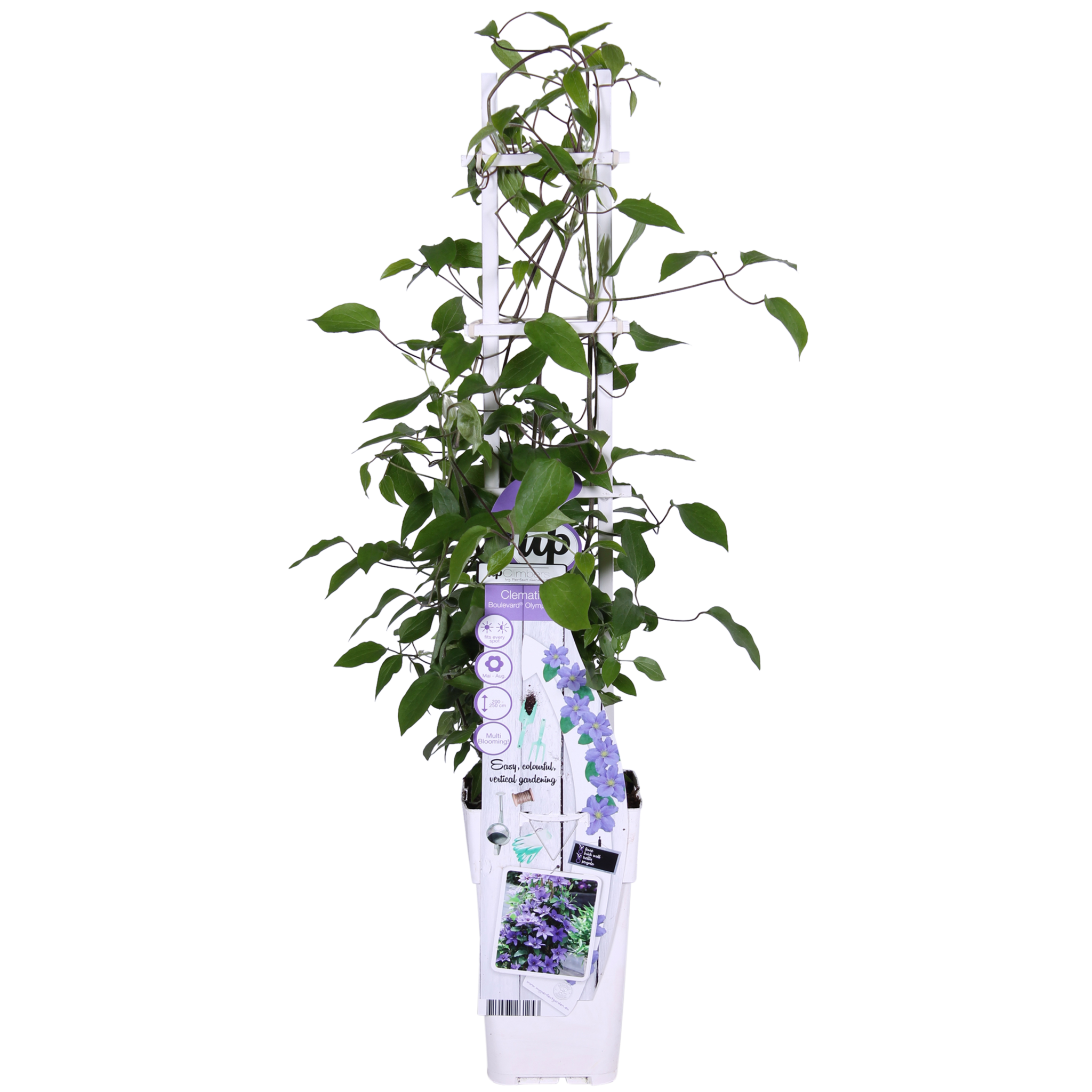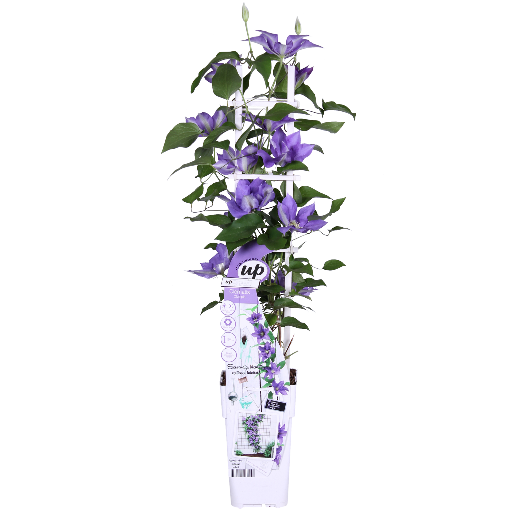 Die 'Clematis Olympia' ist eine kompakt wachsende Waldrebe mit violetten Blüten und cremeweißen Staubgefäßen in der Mitte. Die Clematis hat einen kompakten Wuchs und wird nicht höher als 150 cm. Von Mai bis September kann man sich an den großen violetten Dolden erfreuen. Schon im ersten Jahr bildet die Clematis eine Blütenoase. Im Gegensatz zu den meisten Clematis-Sorten, die 1 bis 2 Monate lang blühen, kann man sich an 'Olympia' bis zu 5 Monate lang erfreuen. Die meisten Kletterpflanzen gedeihen sowohl im Halbschatten als auch in der Sonne sehr gut. Dadurch eignet sich die Clematis für die meisten Standorte in Ihrem Garten. Bei mehr Sonne blüht sie üppiger. Da die Clematis eine kompakte Art ist, kann sie auch in einem Topf auf dem Balkon, der Terrasse oder sogar in einer Blumenampel stehen. Damit die Clematis besser klettern kann, braucht sie ein wenig Hilfe. Am besten ist es, die Pflanze an einem Gestell, Draht oder Stock hochzuführen. Ein Rückschnitt ist nicht notwendig. Entfernen Sie jedoch abgestorbene und beschädigte Zweige.