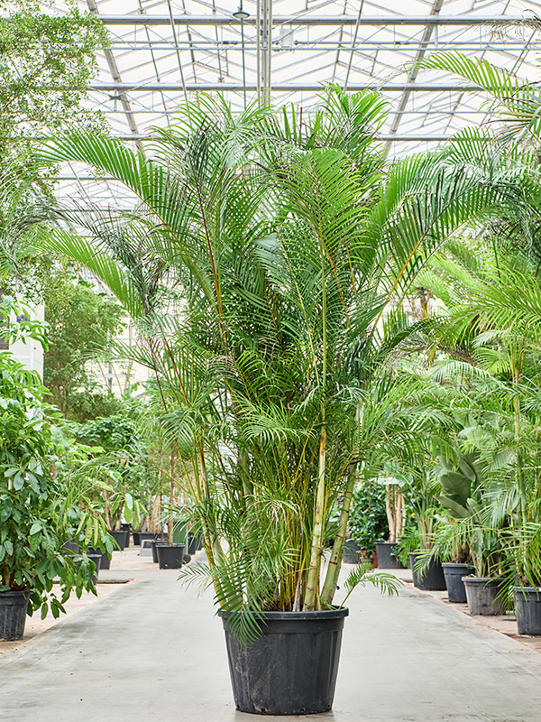 Dypsis lutescens ist eine mittelgroße Palmenart, die bis zu 6 Meter hoch werden kann. Ihre Blätter sind gefiedert und von gelb-grüner Farbe. Die Pflanze hat mehrere Stämme, die von einem zentralen Punkt ausgehen und ihr ein volles und buschiges Aussehen verleihen. Wenn die Pflanze ausgewachsen ist, kann sie kleine, gelbe Blüten hervorbringen, gefolgt von dekorativen, nicht essbaren Früchten, die sich bei der Reifung rot bis schwarz färben.