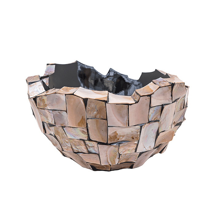 Die Schalen der Serie „Schaal exlcusive“ werden mit größter Präzision mit echten Muscheln verziert. Dadurch erhalten die Töpfe ein sehr exklusives und glänzendes Aussehen. Die Perlmuttfragmente werden einzeln von Hand auf den Topf geklebt. Anschließend werden die Töpfe geglättet und fertiggestellt. Die innere Schicht der Töpfe besteht aus Kunststoff, wodurch die Töpfe ein geringes Gewicht aufweisen.