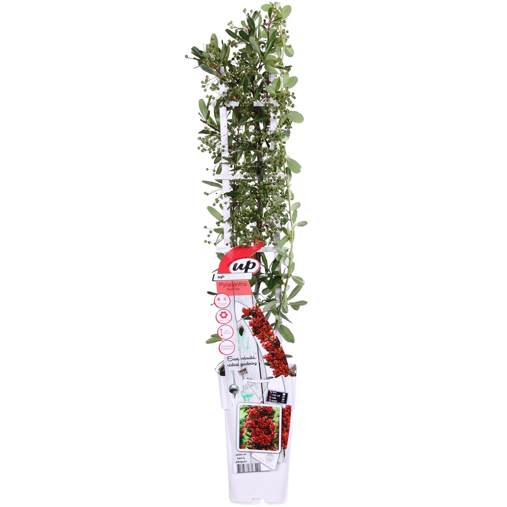 Pyracantha coccinea Red Star' ist ein echter Star unter den Feuerdornsorten. Dieser Feuerdorn hat weniger Stacheln und mehr Beeren als andere Arten. Er ist ein immergrüner Strauch, der im Juni mit weißen Blüten blüht. Die Blüten locken Schmetterlinge und Bienen an. Aus diesen Blüten entwickeln sich dann Beeren, die sich ab September rot färben. Auch Vögel lieben diese Beeren. Ihre schöne, leuchtend intensive Farbe hält bis nach Weihnachten an. Sie ist daher auch ein wunderbares Weihnachtsgeschenk. Die Pflanze trägt reichlich Früchte an zweijährigen Pflanzen. Da sie nur an zweijährigem Holz blüht, ist es nicht ratsam, diesen Strauch stark zu beschneiden. Sie können die Pyracantha als Solitär in einem schönen großen Topf auf den Balkon oder die Terrasse stellen. Sie eignet sich auch sehr gut im Garten und sogar als Hecke. Die Pflanze benötigt zum Klettern eine Stütze, da sie wie ein gewöhnlicher Strauch wächst und daher angebunden werden muss. Ein Platz in der Sonne oder im Halbschatten ist gut für diesen Strauch und er stellt wenig Ansprüche an den Boden, jeder normale bis feuchte Boden ist geeignet. Er ist sehr winterhart bis -30 Grad Celsius.
