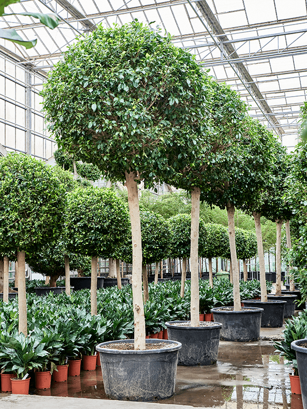 Die Pflege von Ficus microcarpa 'Nitida' erfordert einen gut durchlässigen Boden und ausreichend Sonnenlicht. Sie kann aber auch im Halbschatten wachsen. Diese Art verträgt Trockenheit und Nährstoffmangel gut, reagiert aber positiv auf eine regelmäßige Düngung. Der Baum kann beschnitten werden, um die gewünschte Form und Größe zu erhalten, da er sich leicht an enge Räume und begrenzte Bodenvolumina anpassen lässt. Es ist wichtig, den Boden mäßig feucht zu halten, aber eine Überwässerung sollte vermieden werden, um Wurzelfäule zu vermeiden.