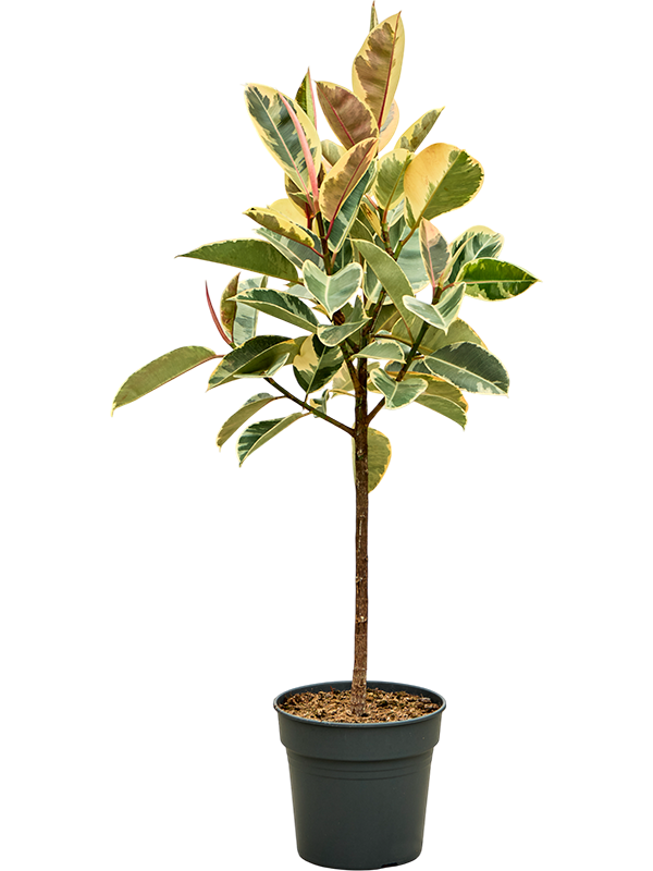 Ficus elastica 'Tineke' zeichnet sich durch seine großen, ovalen Blätter aus, die bis zu 30 cm lang werden können. Das Besondere an dieser Sorte sind ihre Blätter, die in verschiedenen Grüntönen mit Cremeweiß und Rosa gefärbt sind. Die Blätter sind mit einer Art Wachsschicht überzogen, die ihnen ein glänzendes Aussehen verleiht. Die Pflanze kann in Innenräumen bis zu 2 Meter hoch werden, obwohl sie in der freien Natur viel größer wird.
