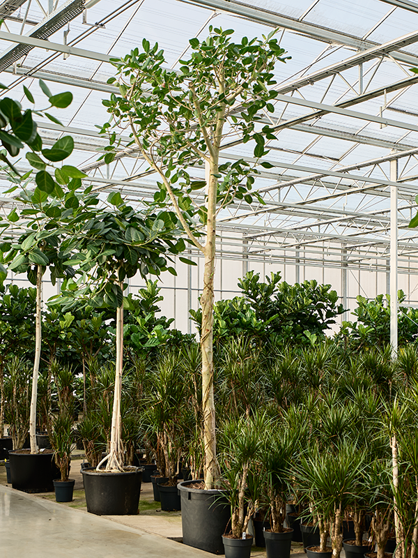 Der Ficus benghalensis 'Audrey' ist eine beeindruckende Zimmerpflanze, die mit ihrer Höhe von 360 cm und einem Topfdurchmesser von 70 cm jeden Raum verwandeln kann. Dieser stilvolle Ficus hat ein üppiges Aussehen mit großen, glänzenden Blättern, die Ihrem Interieur einen Hauch von tropischer Atmosphäre verleihen. Seine elegante Form und seine lebendige grüne Farbe machen ihn zu einem echten Blickfang in Ihrem Zuhause.