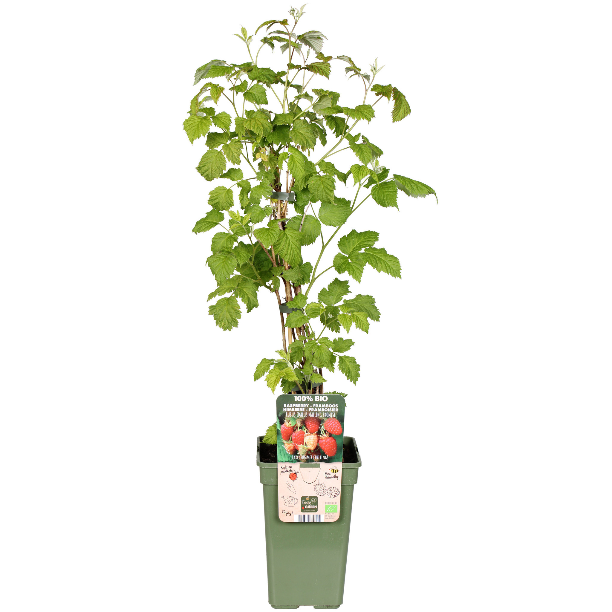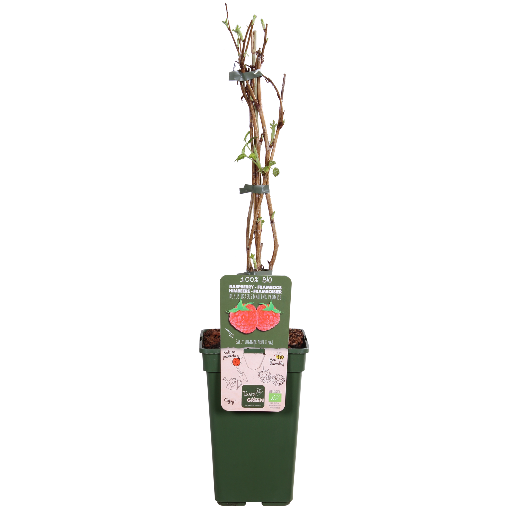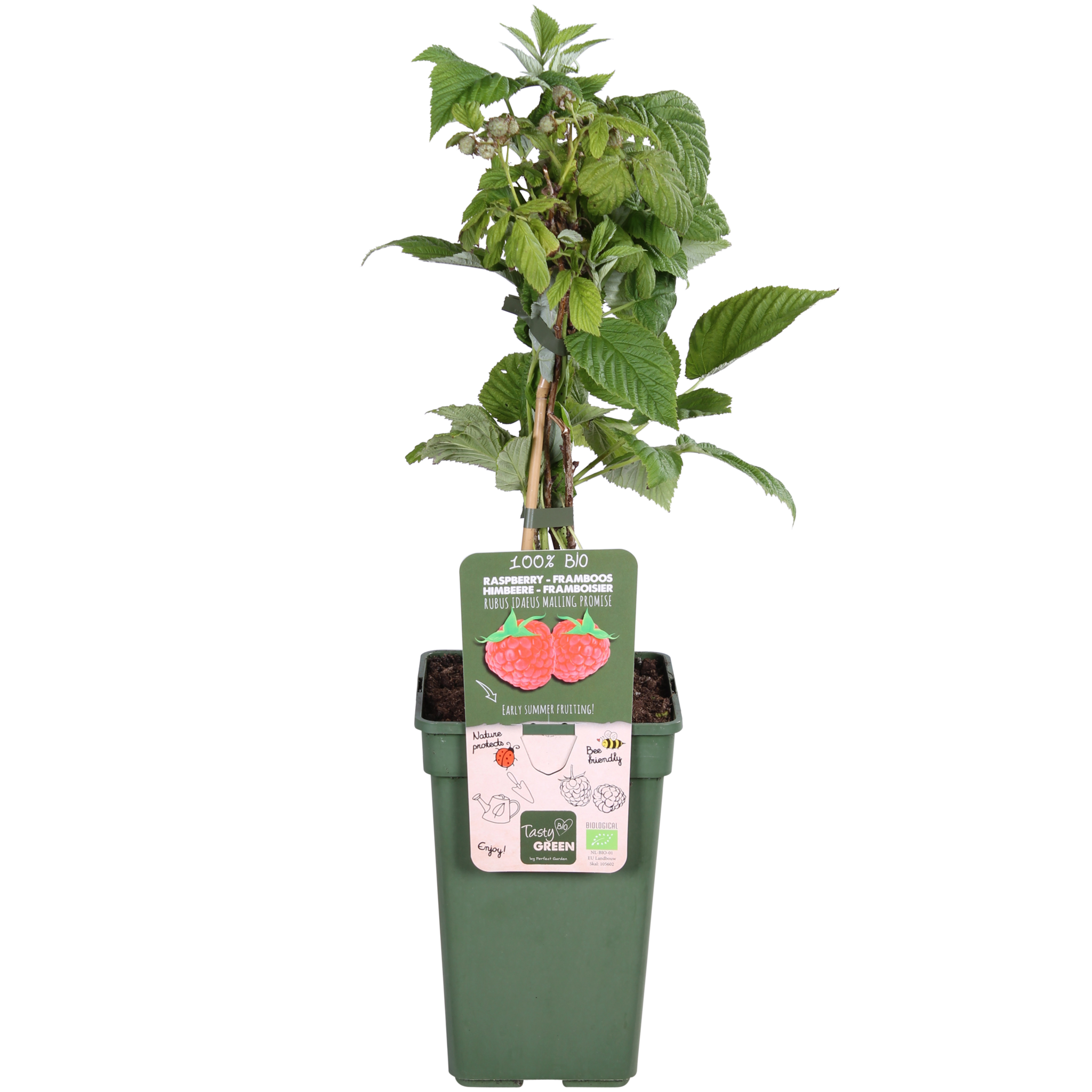 Tasty Green, 100% biologisch angebaute Früchte. Das bedeutet, dass beim Anbau nur pflanzliche und tierische Materialien verwendet wurden. Der Topf und das Etikett sind aus recyceltem Kunststoff und somit eine saubere Lösung für die Umwelt. 'Rubus Idaeus Malling Promise' ist eine der bekanntesten Himbeersorten. Diese Himbeere ist selbstbestäubend und blüht im späten Frühjahr mit unscheinbaren, kleinen weiß-rosa Blüten, die Bienen und Hummeln anlocken. Nach der Blüte entwickeln sich die Himbeeren. Die Früchte sind ziemlich weich, leuchtend rot und haben einen milden Geschmack. Rubus idaeus Malling Promise' ist eine Sommerhimbeere, deren Früchte ab Juli gepflückt werden können.
