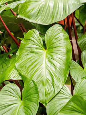 Homalomena rubescens 'Maggy' zeichnet sich durch ihr üppiges Laub mit glänzenden, herzförmigen Blättern aus, die in einer dichten Rosette wachsen. Die Pflanze hat eine tiefgrüne Farbe, die unter den richtigen Lichtverhältnissen von blassgrün bis fast schwarz reichen kann. Außerdem erreicht diese Pflanze eine durchschnittliche Höhe von etwa 60 bis 80 Zentimetern. Homalomena Maggy hat kräftige Stämme, die es der Pflanze ermöglichen, ihre Blätter hoch zu halten.