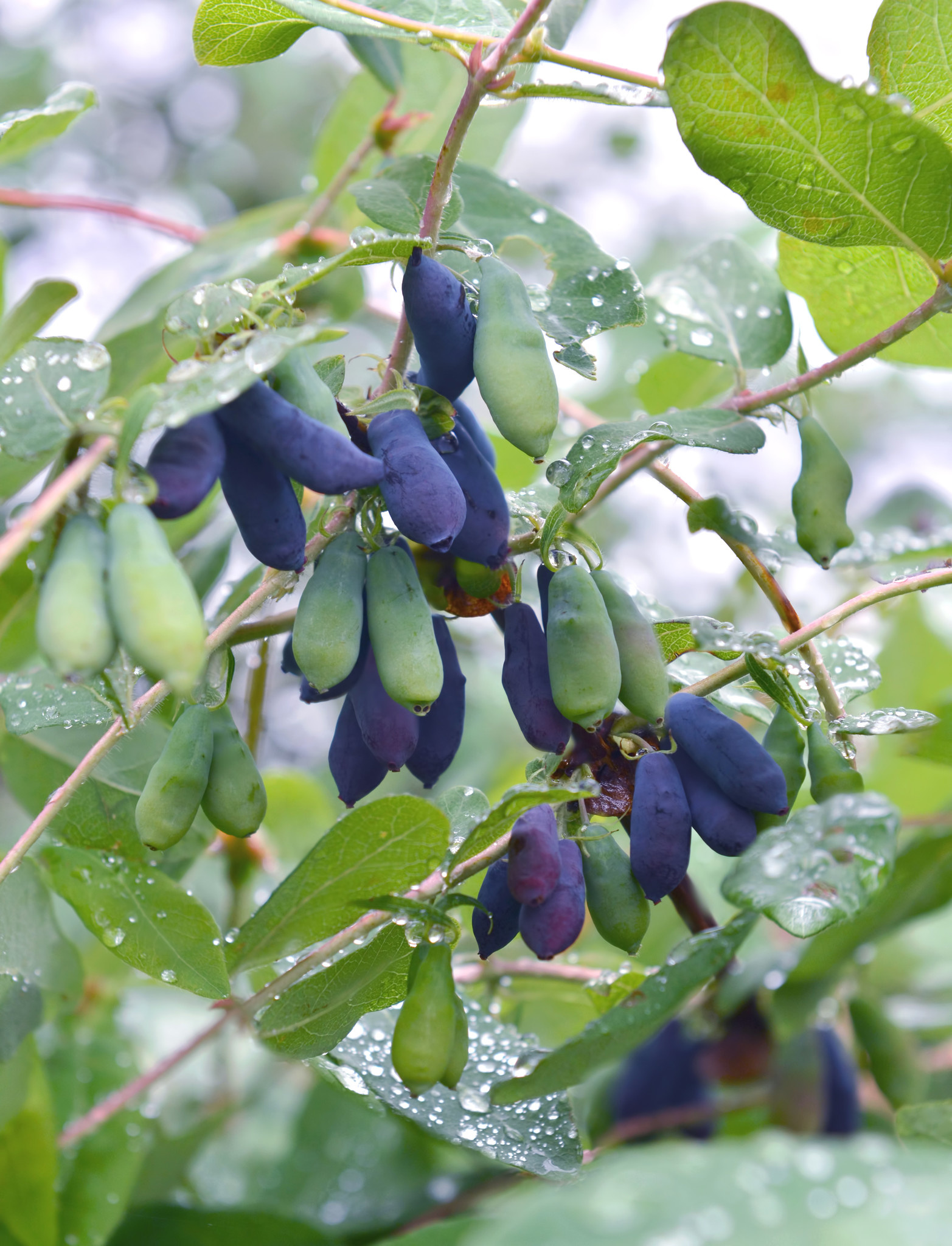 Lonicera Kamtschatica Duet" ist ein blaues Geißblatt, das im Geschmack der Heidelbeere ähnelt. Es stammt ursprünglich aus Nordostasien und Sibirien und ist in den Niederlanden noch relativ unbekannt. Der Strauch ist sehr winterhart und blüht mit unauffälligen grün-gelben Blüten. Der Honigbeerenstrauch ist selbstbestäubend, aber wenn mehrere Pflanzen zusammen gepflanzt werden, ist die Ernte besser. Hummeln sorgen für die Bestäubung. Die Früchte erscheinen später als die von 'Lonicera Kamtschatica', etwa im August/September. Die Beeren haben eine dunkelblaue Farbe, sind etwas größer als der Durchschnitt und haben eine besonders längliche Form. Wie der Name Honeyberry vermuten lässt, ist der Geschmack köstlich süß. Außerdem enthalten sie viele Vitamine. Sie enthalten viel Pektin sowie die Vitamine B und C. Die Beeren eignen sich zum Einarbeiten in ein Gericht oder zum Verzehr frisch gepflückt. Auch Vögel lieben die Honigbeere, daher empfiehlt es sich, sie vorübergehend mit einem Netz oder einer Folie abzudecken. Sie wird maximal 100 cm hoch, so dass ein Rückschnitt kaum erforderlich ist. Lonicera Kamtschatica Duet' bevorzugt einen sonnigen bis halbschattigen Platz in einem durchlässigen, aber leicht feuchten Boden.
