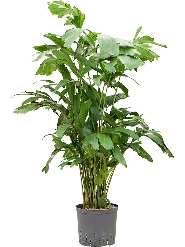 Die Caryota mitis ist eine einzigartige Palme mit gefiederten Blättern, die durch ihre ungewöhnliche Form auffallen. Die Blätter sind nämlich segmentiert und jedes Segment hat die Form eines Fischschwanzes, was in der Welt der Palmen ziemlich einzigartig ist. Diese Palme kann unter idealen Bedingungen bis zu 12 Meter hoch werden und entwickelt zahlreiche Stämme, die aus demselben Wurzelstock sprießen, daher auch ihr Name „Clusterpalme”.