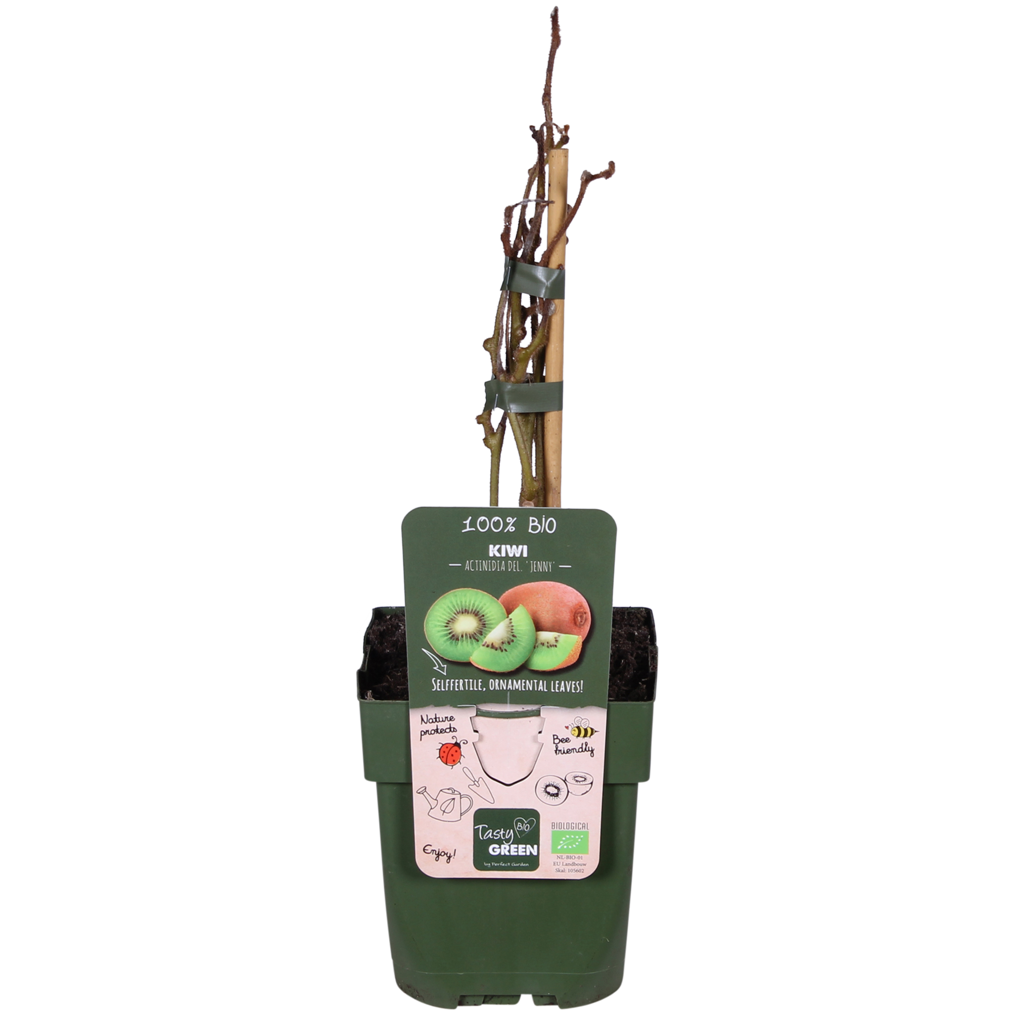 Tasty Green, 100% biologisch angebaute Früchte. Das bedeutet, dass beim Anbau nur pflanzliche und tierische Materialien verwendet wurden. Der Topf und das Etikett sind aus recyceltem Kunststoff und somit eine saubere Lösung für die Umwelt. Actinidia delciosioa Jenny' ist eine leicht und selbstbestäubende Kiwi. Der Ursprung der Kiwi liegt in China. Die Samen wurden im frühen 20. Jahrhundert nach Neuseeland gebracht. Als die Kiwi zu einem wichtigen Exportprodukt wurde, benannte man die Pflanze nach dem berühmten flugunfähigen Vogel, dem Kiwi. Die Kiwi ist eine schnell wachsende, schwankende Rebe, die am besten an einem Klettergerüst, einem Zaun oder einer Pergola gedeiht. Die Kiwi blüht im Mai und Juni mit weiß-rosa Blüten. Die ersten reifen Früchte erscheinen Anfang September. Denken Sie daran, dass es mehrere Jahre dauern kann, bis die Pflanze Früchte trägt. Im Allgemeinen dauert es etwa drei bis fünf Jahre. Die Früchte haben eine haarige Schale, sind oval und haben ein leuchtend grünes Fruchtfleisch mit einem weißen Kern und einem Ring aus schwarzen Samen um diesen Kern. Die Kiwi ist gesund und enthält viel Vitamin C.