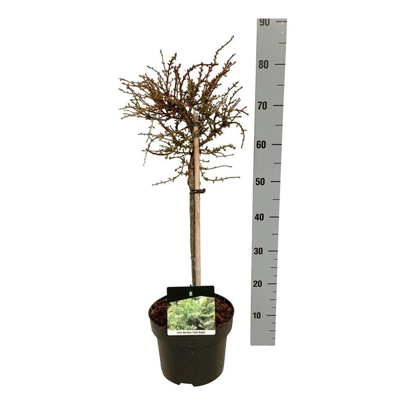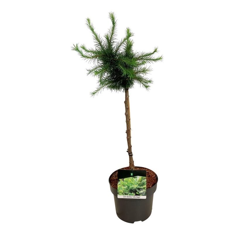 Larix decidua Little Bogle ist ein langsam wachsender Nadelbaum mit einer dichten, kegelförmigen Wuchsform. Das Laub besteht aus feinen, hellgrünen Nadeln, die sich im Herbst goldgelb färben und den Baum zu einem schönen saisonalen Element machen. Im Winter verliert dieser Baum seine Nadeln, was für die europäische Lärche charakteristisch ist.