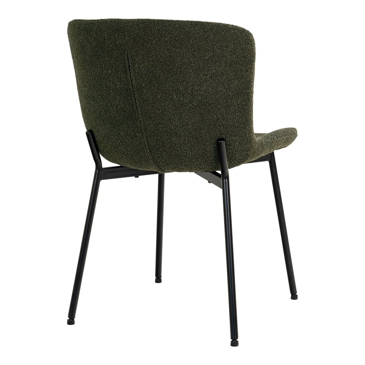 De Maceda eetkamerstoel is een geweldige keuze om zowel stijl als comfort aan uw eethoek toe te voegen. De zachte bouclébekleding zorgt voor een comfortabele zitervaring en voegt een visueel aantrekkelijke textuur toe, terwijl de zwart gecoate stalen poten een stevig en modern onderstel bieden. De donkergroene kleur voegt een vleugje rijkdom en persoonlijkheid toe aan de kamer.