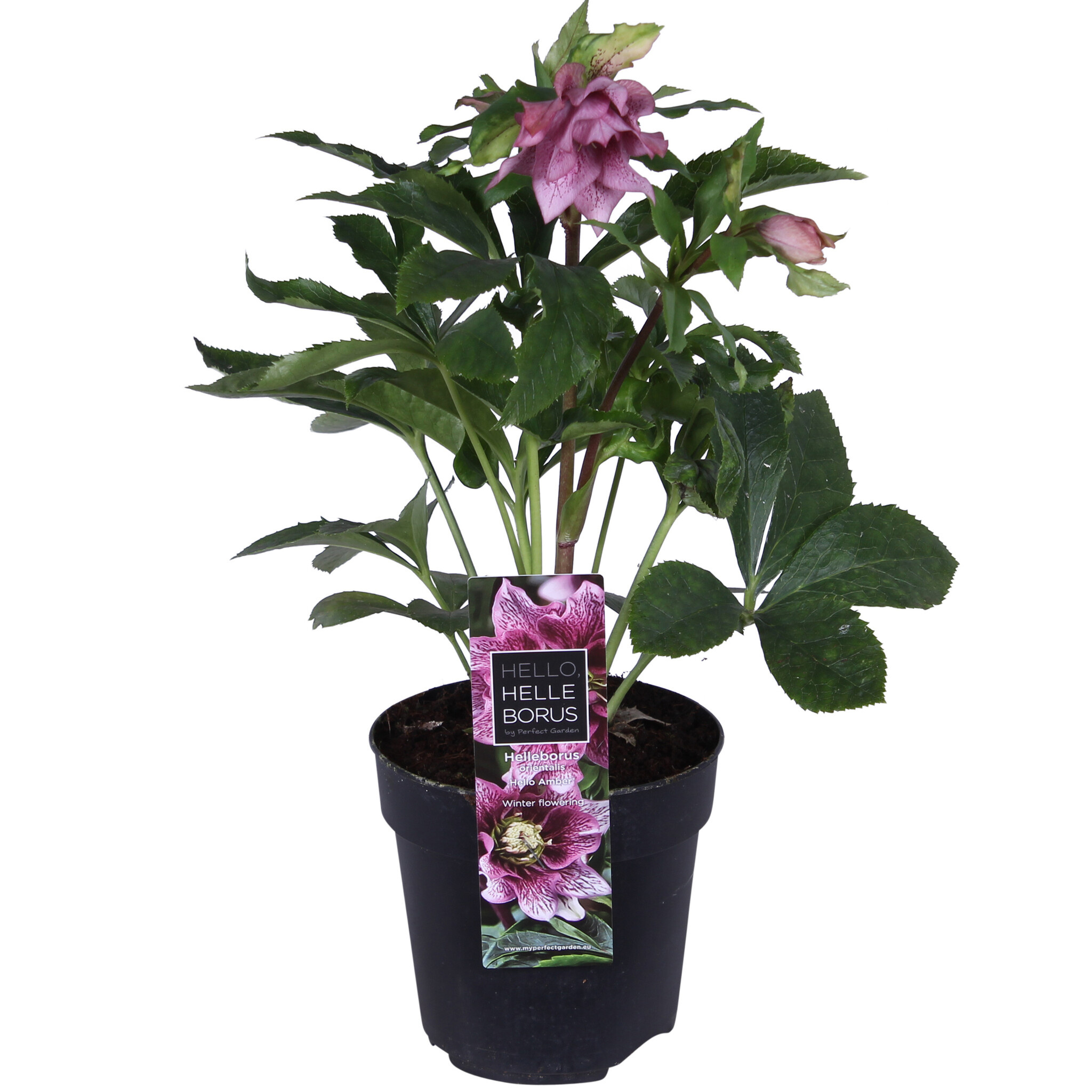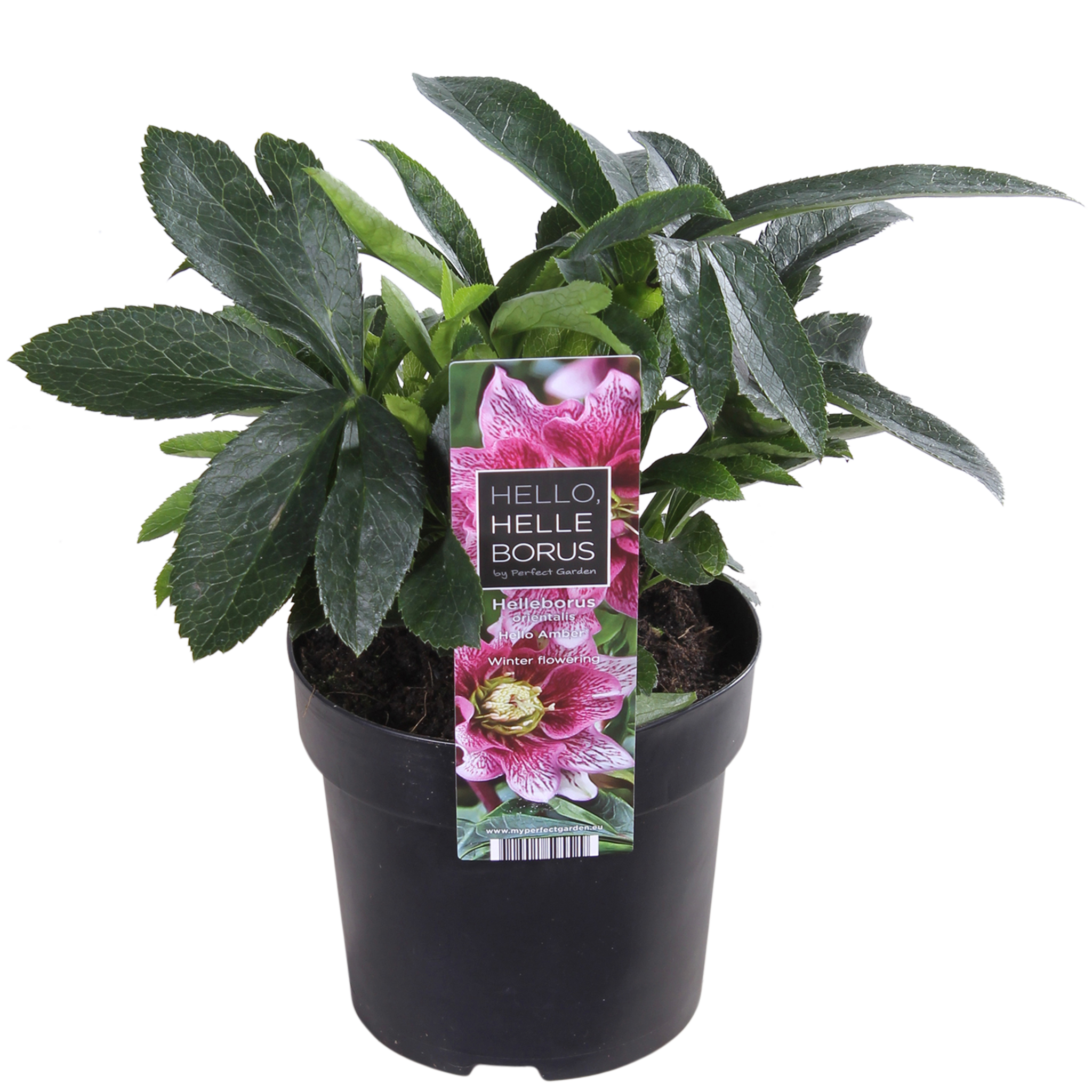Helleborus orientalis Hello Amber", auch Frühlingsrose genannt, bringt im Winter und Vorfrühling Farbe in den Garten oder auf die Terrasse. Als eine der wenigen Pflanzen, die im Winter und Vorfrühling blühen, ist die Nieswurz auch attraktiv für die ersten Bienen, die aus dem Winterschlaf erwachen. Die Pflanze ist sowohl im Garten als auch auf der Terrasse sehr einfach zu verwenden. Die Blüten mit weißen bis rosafarbenen Blütenblättern sind mit dunkelrosa Sprenkeln übersät und erscheinen von Dezember bis April. Nach außen hin verblassen die Blüten zu blassem Rosa oder Weiß. Schneiden Sie die unansehnlichen Blätter nach dem Winter bis auf den Boden zurück, dann treibt die Pflanze im Frühjahr wieder neue Blätter aus. Diese Gartenpflanze steht nicht gerne in der prallen Sonne, gedeiht aber gut an einem Standort mit Morgen- und/oder Abendsonne. Die Helleborus bevorzugt einen geschützten Platz in humusreichem, feuchtem Boden und stellt nur geringe Ansprüche an den Boden.