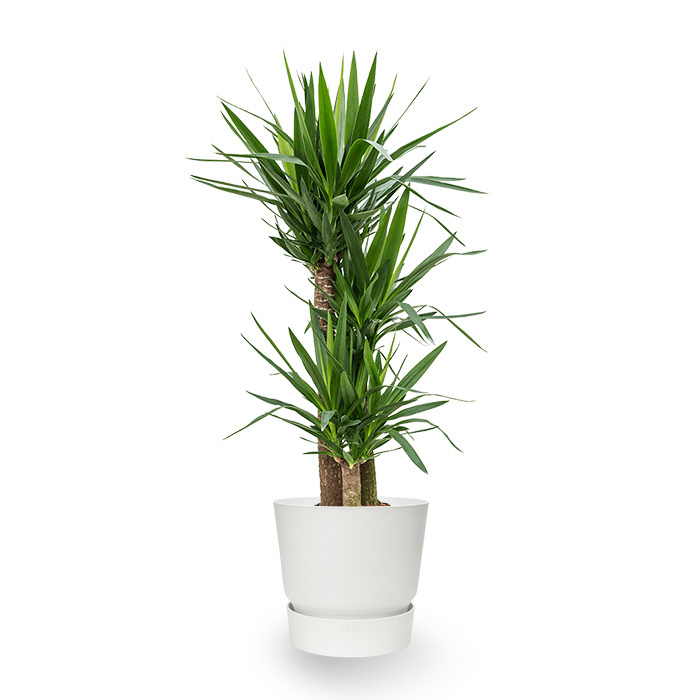Die Yucca oder „Palmlilie” ist eine charakteristische Pflanze mit einem modernen Aussehen. Durch ihren kräftigen Stamm und ihre spitzen Blätter hat die Yucca ein robustes Aussehen und ist zudem eine pflegeleichte Pflanze. All diese Faktoren machen die Yucca zu einer idealen Zimmerpflanze.