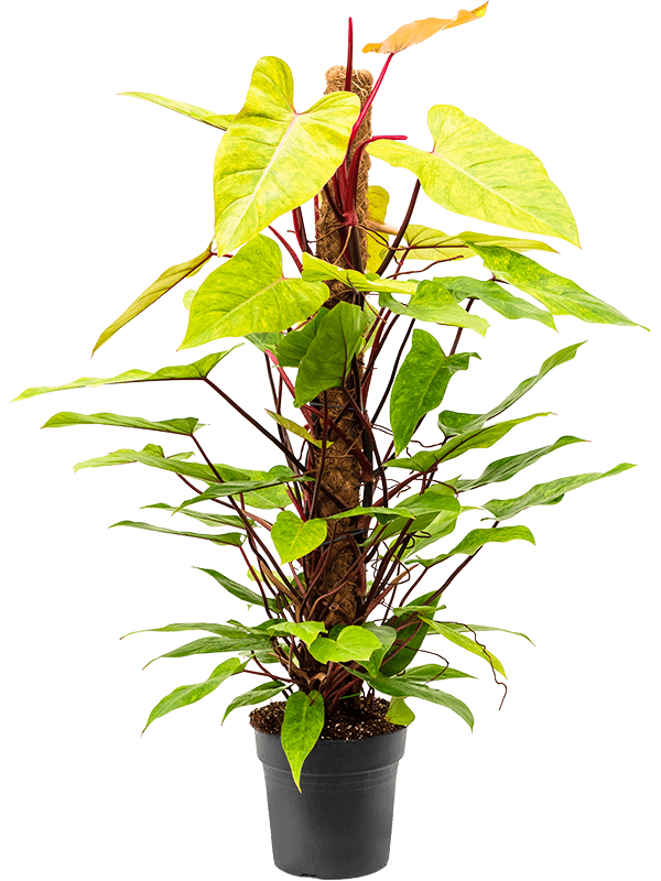 Philodendron 'Painted Lady' zeichnet sich durch seine panaschierten, herzförmigen Blätter aus, die von grün bis fast gelb reichen können. Die Blätter zeichnen sich durch ihre unregelmäßigen Streifen und Flecken aus, daher der Name 'Painted Lady'. Eine ausgewachsene 'Painted Lady' kann eine Höhe von etwa 1 Meter erreichen. Sie ist eine Kletterpflanze und eignet sich daher ideal für den Anbau an einem Moosstock.