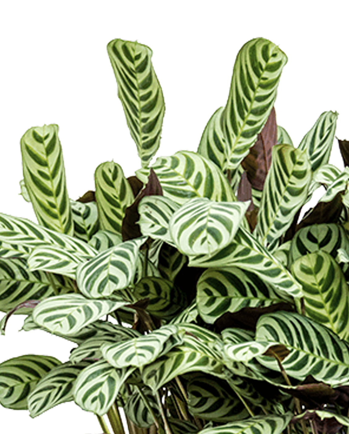 Die Calathea ist für ihre besonders gestreiften und farbigen Blätter bekannt. Die schöne Zeichnung auf den Blättern sorgt für ein besonderes und auffälliges Aussehen. Die Calathea mag einen hellen Standort, aber direktes Sonnenlicht auf den Blättern ist schädlich.