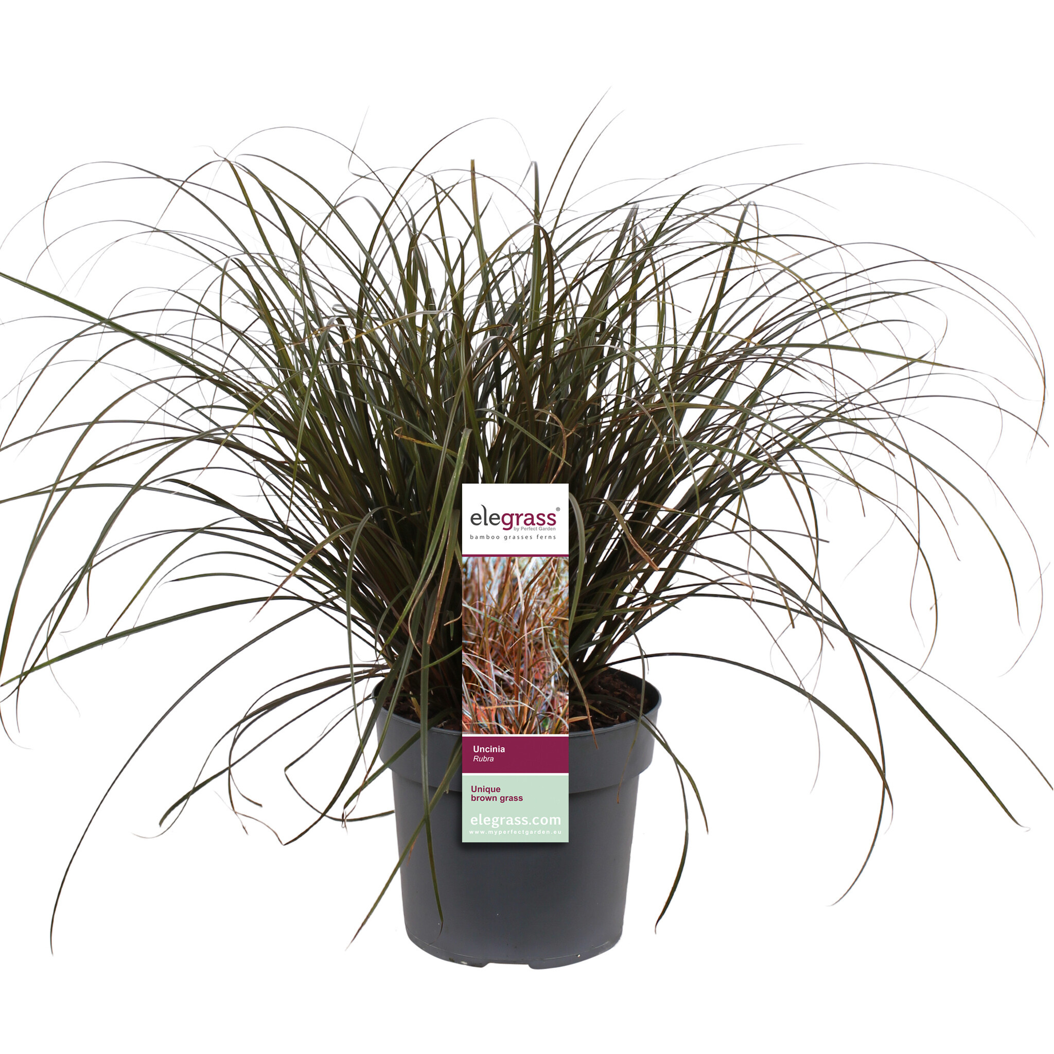 Uncinia rubra", auch als Rotsegge bekannt, ist ein auffälliges Gras mit zierlichen rotbraunen, dünn gestreiften Blättern. In den Sommermonaten blüht es mit rotbraunen Rispen und wird etwa 40 cm hoch. Diese Pflanze macht sich gut in einem Ziertopf auf dem Balkon oder der Terrasse. Uncinia' ist immergrün, einigermaßen winterhart und widerstandsfähig gegen Sonnenlicht. Sie bevorzugt einen humusreichen, feuchten, durchlässigen Boden und stellt nur geringe Ansprüche an den Boden. Bei strengem Frost wird ein gewisser Schutz der Pflanze empfohlen. Das liegt daran, dass die Pflanze aus Neuseeland stammt, wo sie strenge Winter weniger gut verträgt.