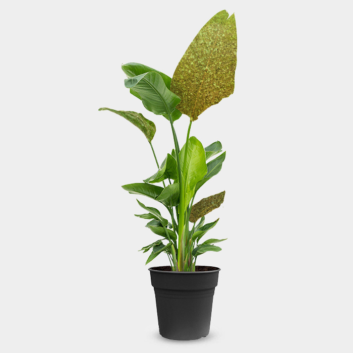 Die Strelitzia ist eine Pflanze, die schnell aus dem Zentrum der Pflanze heraus wächst. Folglich produziert die Pflanze auch schnell neue Blätter. Um die Kraft für die neuen Blätter zu erhalten und um in die Höhe zu wachsen, wirft die Pflanze ihre unteren Blätter ab. Es ist also nicht verwunderlich, wenn die unteren Blätter braun werden. Schneiden Sie sie am besten nahe am Stamm ab, damit die Pflanze die Energie für die neuen Blätter behält. Es kann vorkommen, dass das Blatt reißt. Das ist bei einer Pflanze mit großen Blättern normal. Das liegt daran, dass die Blätter aufgerollt aus der Pflanze herauswachsen. Oft ist das Blatt so groß, dass der obere Teil des Blattes bereits beginnt, sich zu entfalten, während der untere Teil des Blattes noch nicht voll ausgewachsen ist. Infolgedessen entfaltet sich das Blatt dann bereits teilweise, was die Risse im Blatt erklärt.