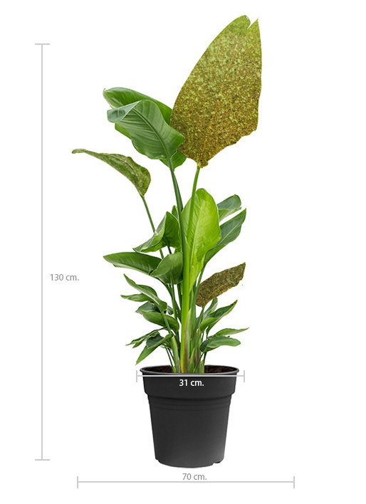 Exklusiv bei Fleurdirect können Sie eine Strelitzie mit einigen goldenen Blättern bestellen. Die goldenen Blätter verleihen der Pflanze einen einzigartigen Effekt. Sehr originell für Weihnachten. Einige Blätter sind an der Spitze für Sie vergoldet. Dies hat keine schädlichen Auswirkungen auf die Pflanze. Die neuen Blätter werden einfach wieder grün sein. Die Pflege dieser Pflanze unterscheidet sich nicht von der einer normalen Strelitzie. Der natürliche Prozess dieser Pflanze, wenn sie sich entfaltet, lässt die Blätter reißen. Dies verleiht der Pflanze ein robustes und botanisches Aussehen.