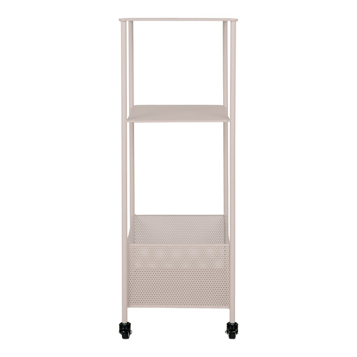De Torres Metal Cart biedt handige opslag en mobiliteit met zijn drie planken en rollende zwenkwielen. De zandkleurige stalen constructie zorgt voor een moderne en industriële uitstraling, geschikt voor diverse ruimtes in uw huis, van de keuken tot de badkamer of het thuiskantoor.