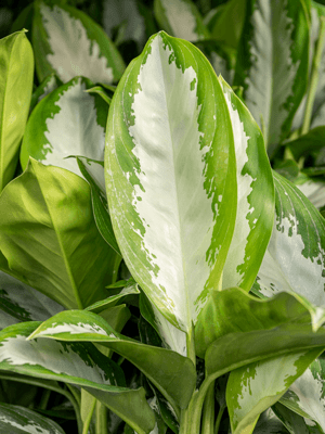 Aglaonema 'Diamond Bay' ist für ihr dekoratives Laub bekannt. Die Blätter sind dunkelgrün mit silbernen Streifen und wachsen in einer attraktiven aufrechten Form. Die Pflanze hat außerdem kleine weiße Blüten, die sich zu orangeroten Beeren entwickeln. Aglaonema 'Diamond Bay' kann bis zu 1,5 Meter hoch werden.