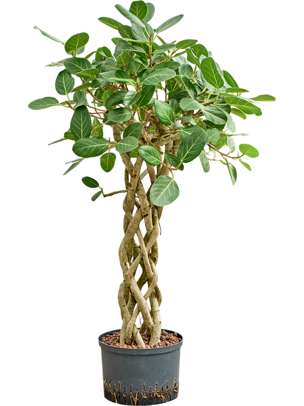 Ficus benghalensis 'Audrey', auch bekannt als Banyanbaum, stammt ursprünglich aus Indien und Pakistan. Er gilt dort als heiliger Baum und wird oft in der Nähe von Tempeln gepflanzt. Er ist eine tropische Pflanze, die besonders gut mit Hitze zurechtkommt.