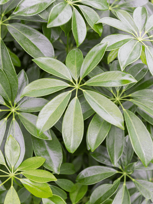 Schefflera arboricola 'Compacta' ist eine beliebte Zimmerpflanze, die sich durch ihre kompakte Wuchsform und ihre glänzend grünen Blätter auszeichnet. Die Blätter dieser Pflanze sind kleiner und haben einen dichteren Wuchs als bei der Standard-Schefflera arboricola. Die Blattstellung ähnelt Miniaturhänden oder Fingern, die aus einem Stock herausragen. Die Pflanze kann schließlich zwischen 1 und 1,5 Meter hoch werden.