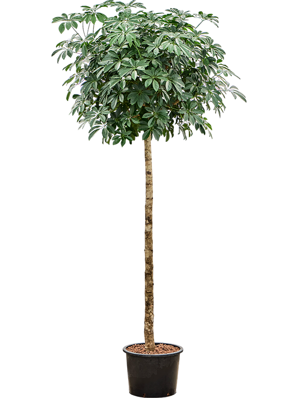Schefflera arboricola 'Compacta' ist eine beliebte Zimmerpflanze, die sich durch ihre kompakte Wuchsform und ihre glänzend grünen Blätter auszeichnet. Die Blätter dieser Pflanze sind kleiner und haben einen dichteren Wuchs als bei der Standard-Schefflera arboricola. Die Blattstellung ähnelt Miniaturhänden oder Fingern, die aus einem Stock herausragen. Die Pflanze kann schließlich zwischen 1 und 1,5 Meter hoch werden.